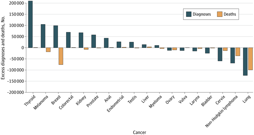 [..] Since 1992, more than 200 000 additional young women and men received diagnoses of thyroid cancer, while the number of deaths has remained virtually unchanged. Furthermore, there have been more than 100 000 additional diagnoses of melanoma and breast cancer, despite declines in deaths of each. At the other extreme, there have been roughly 130 000 fewer lung cancer diagnoses and nearly 100 000 fewer deaths, a remarkable public health success story that underscores the effect of the decline in cigarette smoking. There have also been substantial declines in non-Hodgkin lymphoma diagnoses and deaths due to better HIV treatment, addressing a powerful risk factor, and improvements in lymphoma treatment itself.