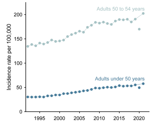 “early-onset cancer has emerged as a federal health priority. The Cancer Grand Challenges program, funded by the National Cancer Institute and Cancer Research UK, has allocated $25 million to uncover biological causes for rising rates. Early-onset cancer has also been highlighted as an area of scientific focus in the US National Cancer Plan. Research interest has concurrently surged, with the proportion of PubMed citations related to early-onset cancer more than tripling during the past 3 decades. Rising rates have also prompted recent shifts in policy, such as the US Preventive Services Task Force lowering the recommended initial age for colorectal cancer and breast cancer screening to 45 and 40 years, respectively. Despite these efforts, a critical question remains unanswered: are rising rates of early-onset cancer a true signal of increasing cancer occurrence?